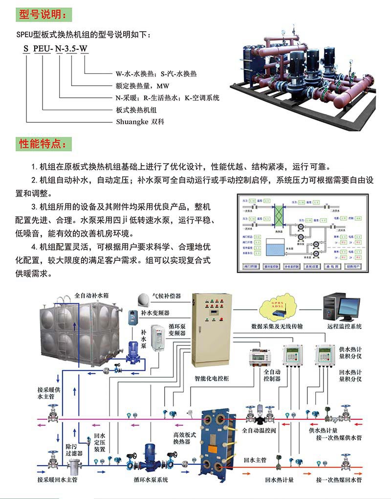 SPEU型板式換熱機組是我公司根據我國供熱行業發展趨勢,專門針對供暖區域來設計開發的有效型換熱機組,是集城市供熱技術、智能化控制技術與人性化結構設計于一體的智能型熱交換機組,具有強大的功能來完成所有建筑物的各種區域熱能需求??蓮V泛適用于工廠、機關、學校、住宅小區、別墅等民用建筑;商場、賓館、飯店、度假村等商用建筑的采暖、空調、洗浴用水、生活用水、游泳池冬日用水。