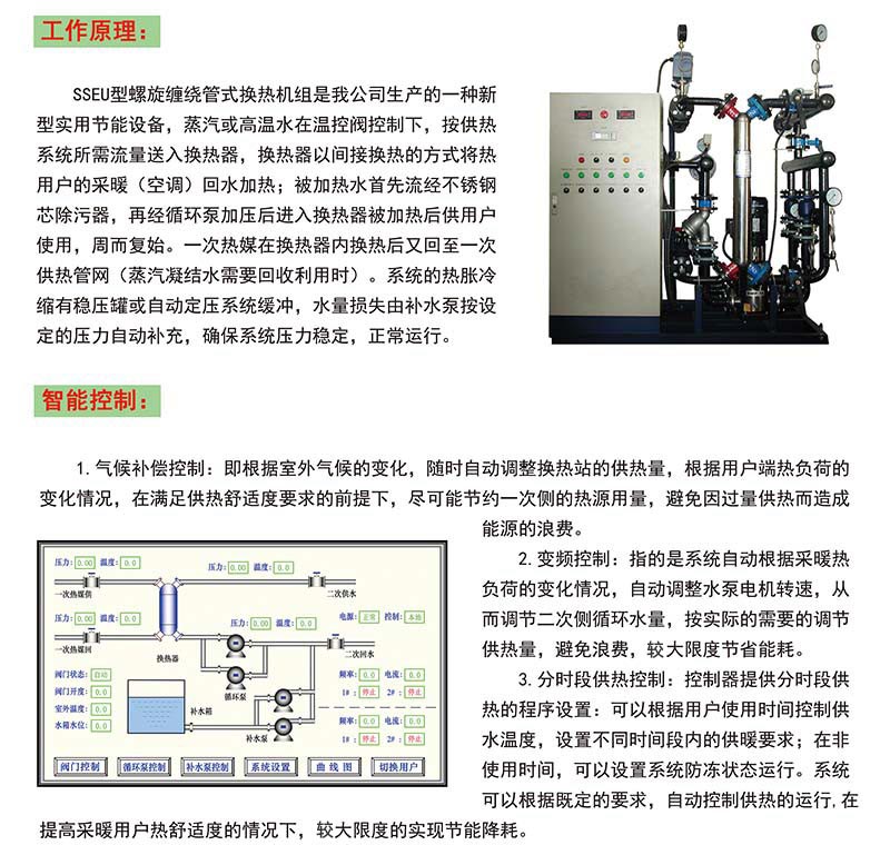 螺旋纏繞管式換熱機組是集成了雙科螺旋纏繞管式換熱器、循環泵、補水泵、溫度計、壓力表、各種傳感器、二次側管路、閥門及工控于一體的成套區域供熱設備。同時結合先進的控制技術以及豐富的經驗,為用戶量身定做更合適的、性能優良的換熱系統解決方案。